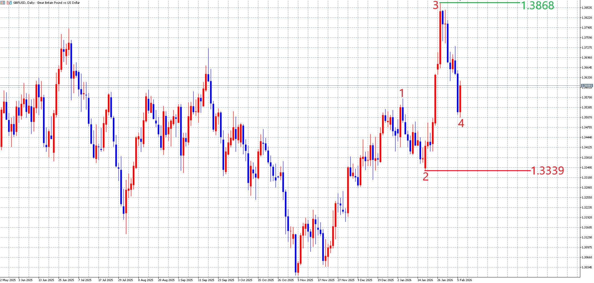 目先の相場の動きは、以下のポンドドルの日足チャートの画像の様な動きを想定しています。