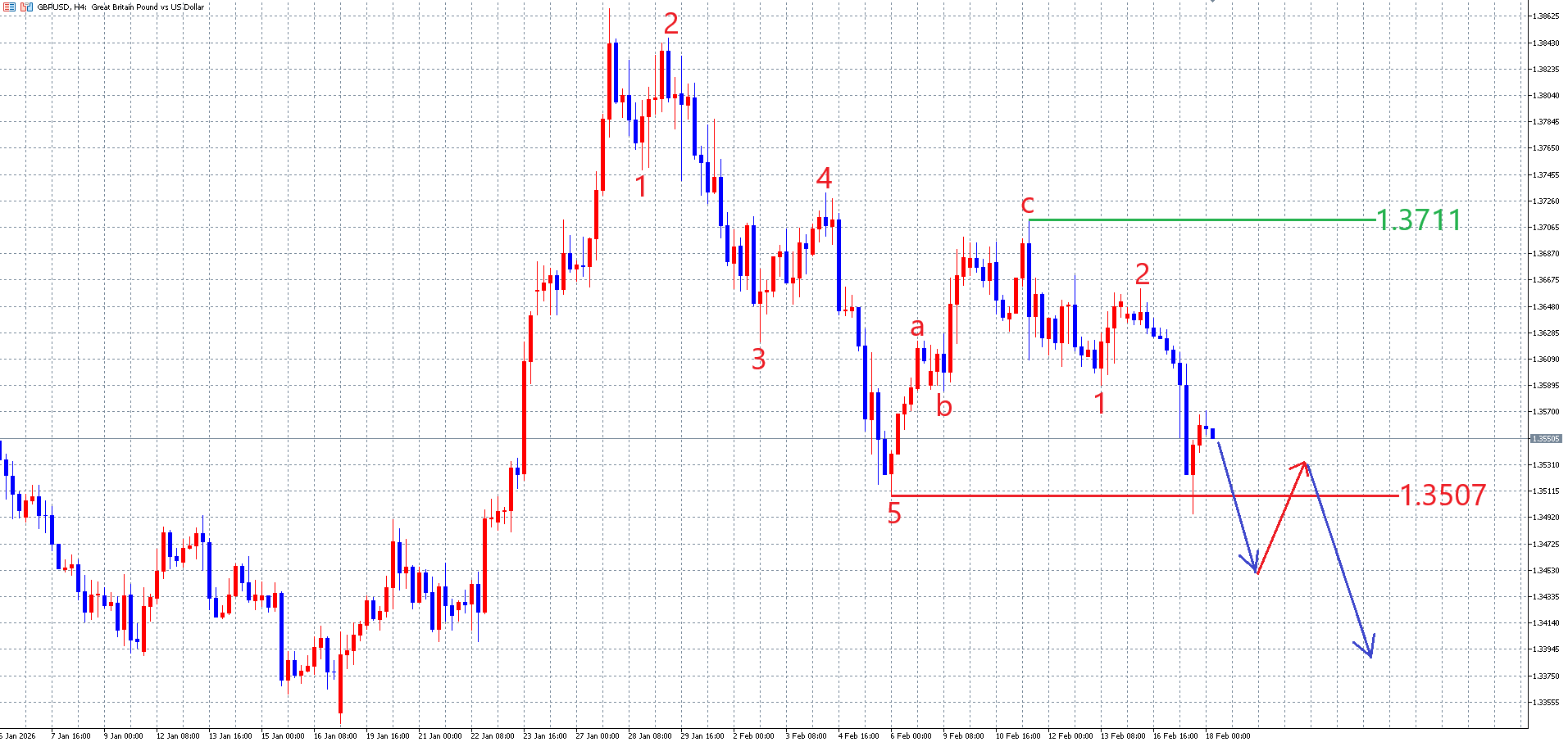 目先の相場の動きは、以下のポンドドルの4時間足チャートの画像の様な動きを想定しています。