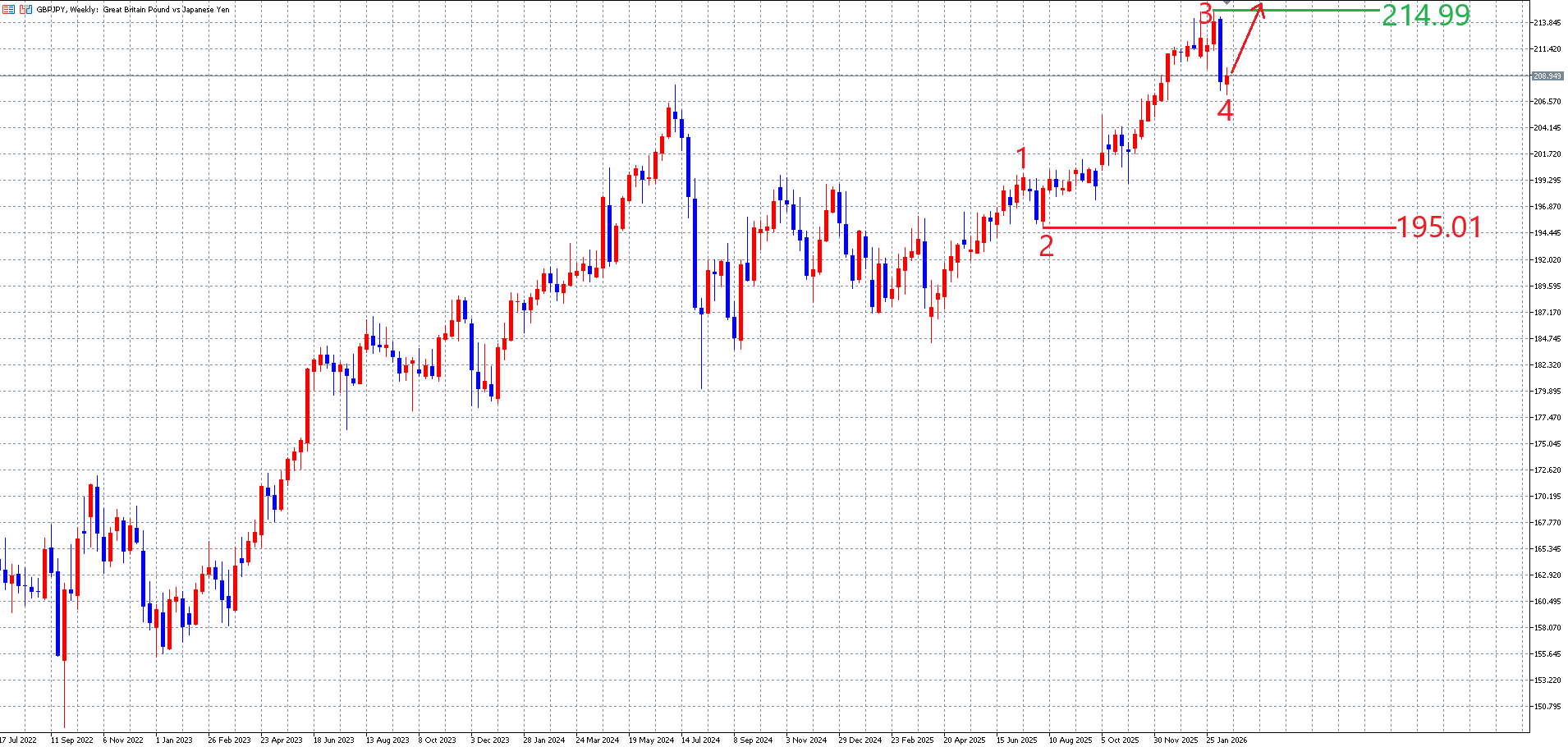 目先の相場の動きは、以下のポンド円の週足チャートの画像の様な動きを想定しています。