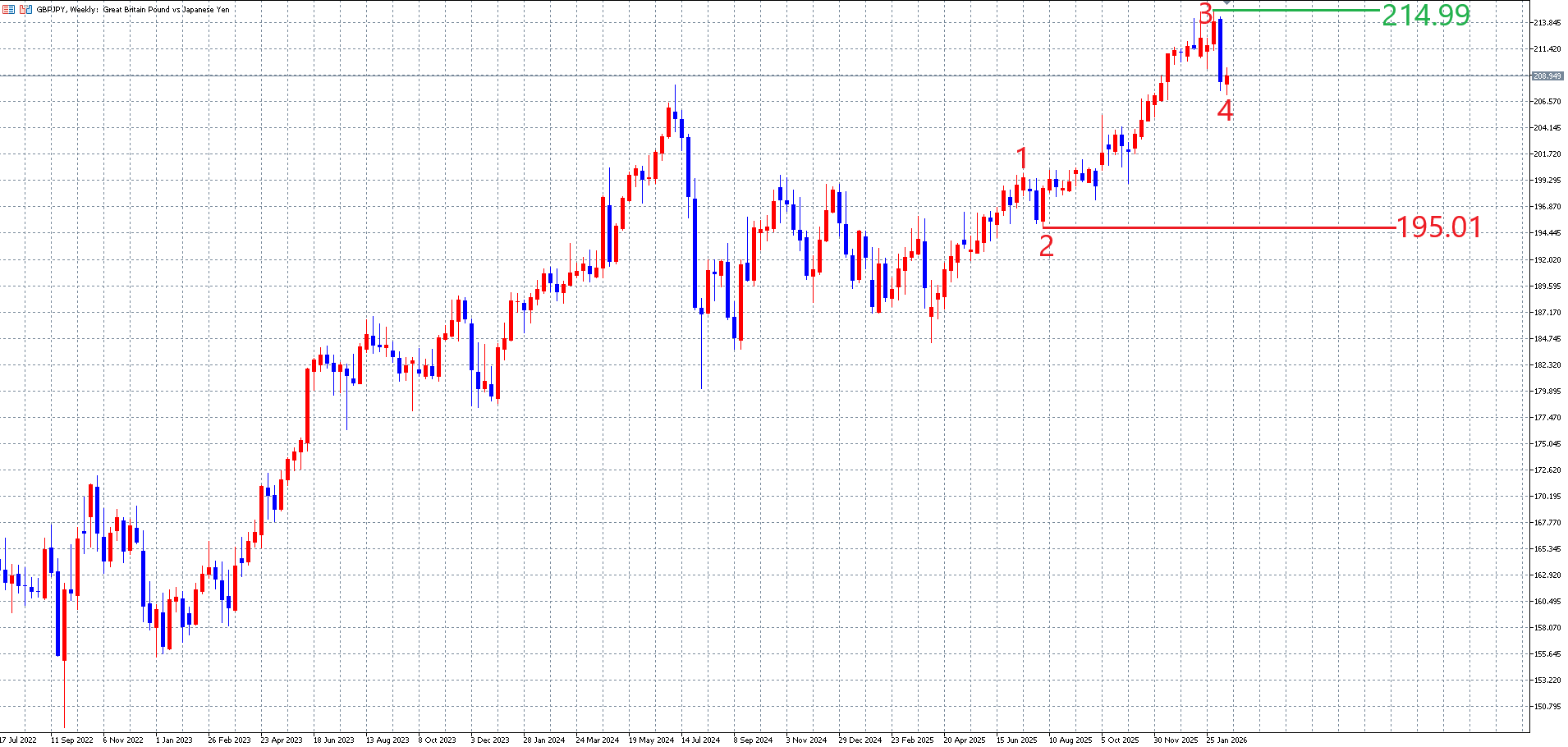 ポンド円の週足チャートです。