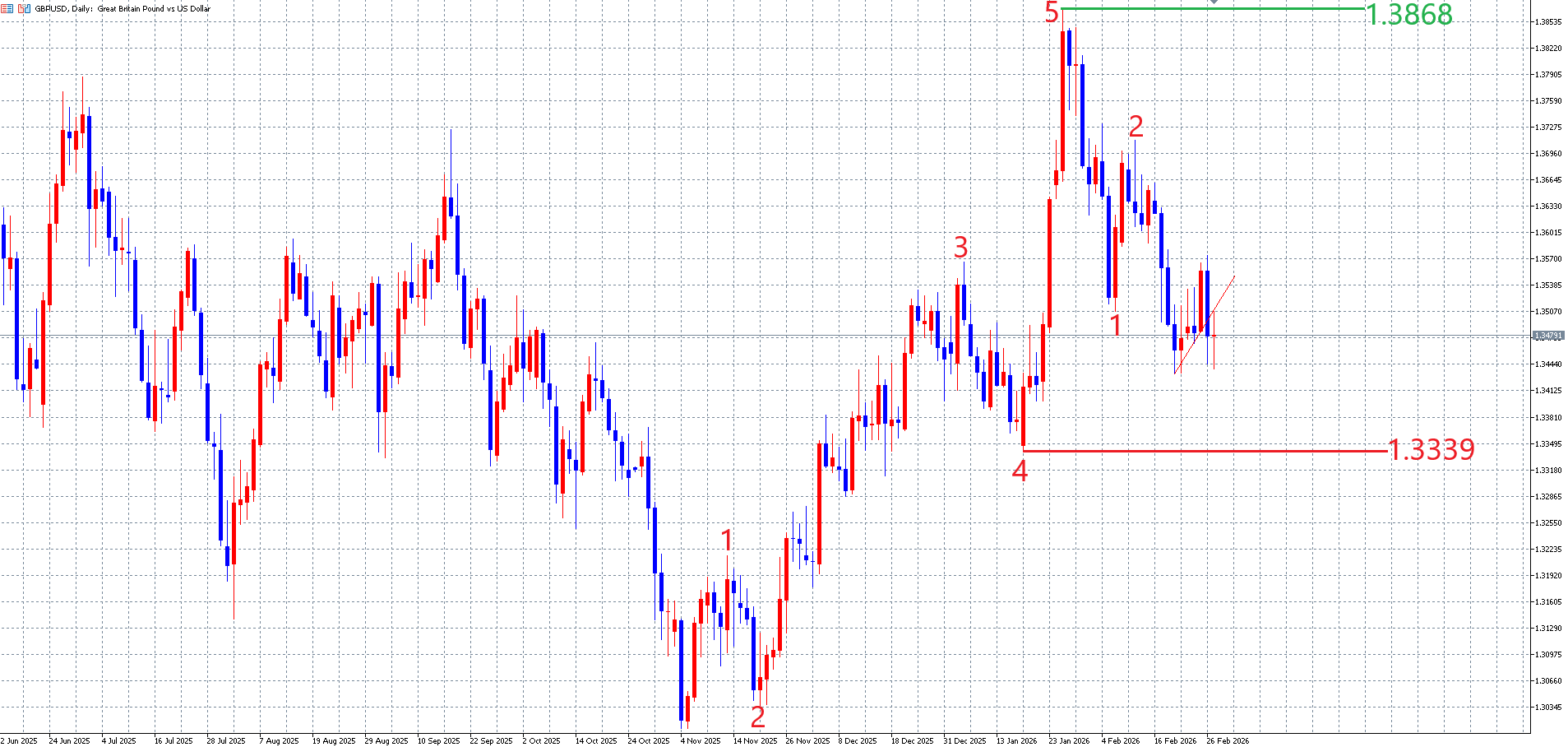 目先の相場の動きは、以下のポンドドルの日足チャートの画像の様な動きを想定しています。