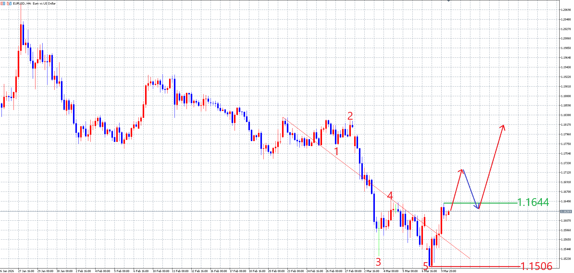 目先の相場の動きは、以下のユーロドルの4時間足チャートの画像の様な動きを想定しています。