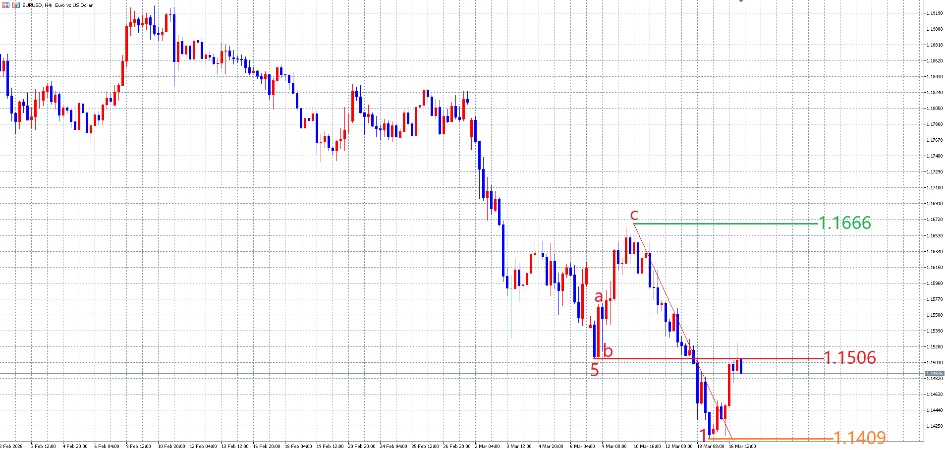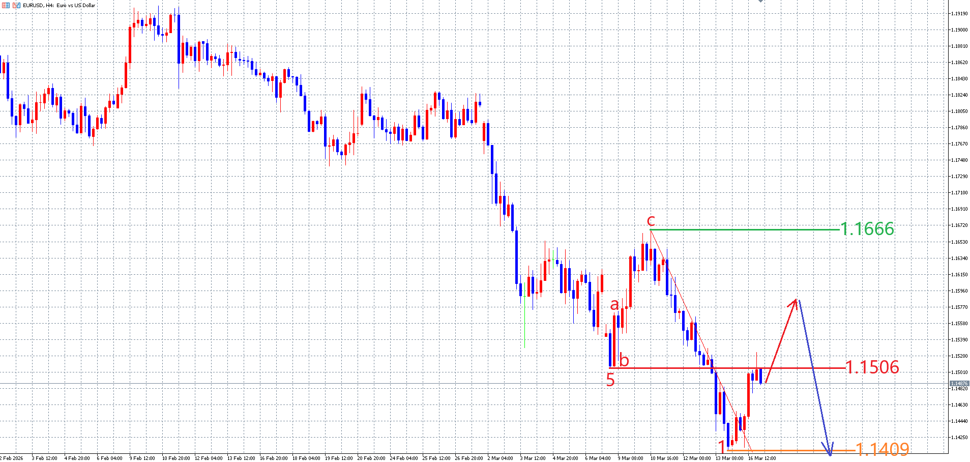 目先の相場の動きは、以下のユーロドルの4時間足チャートの画像の様な動きを想定しています。