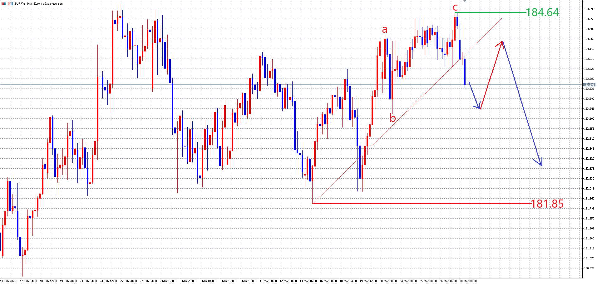 目先の相場の動きは、以下のユーロ円の4時間足チャートの画像の様な動きを想定しています。